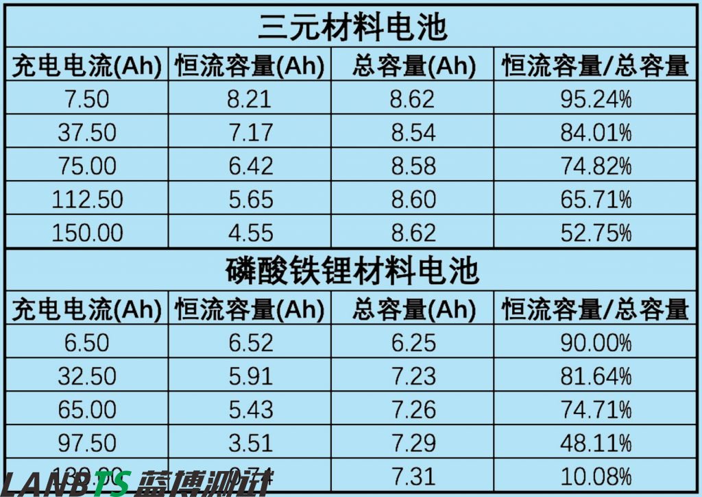 從表中可以看出,三元鋰電池與磷酸鐵鋰電池在10C以下充電時(shí),恒流比無(wú)明顯差距,10C以上倍率充電時(shí),磷酸鐵鋰電池恒流比例迅速降低,充電效率迅速降低。