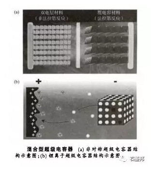 混合型超級電容器一般是指由不同類型正負(fù)極電極材料組成的器件:一極是含贗電容電池材料,另一極是雙電層電容器材料?;旌闲团K電容器結(jié)合了雙電層材料的快速充放電和贗電容的高能m密度的特性,可同時(shí)具有高功率密度和高能量密度,彌補(bǔ)了在電池和超級電容器兩者不可兼得的空缺。
